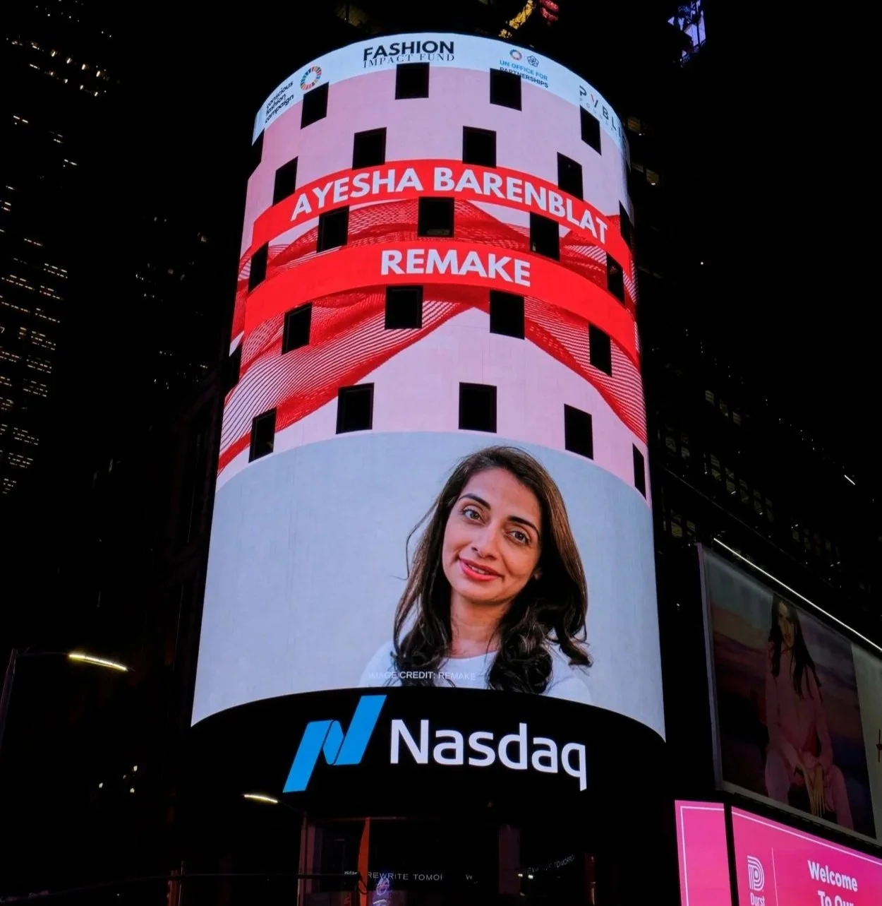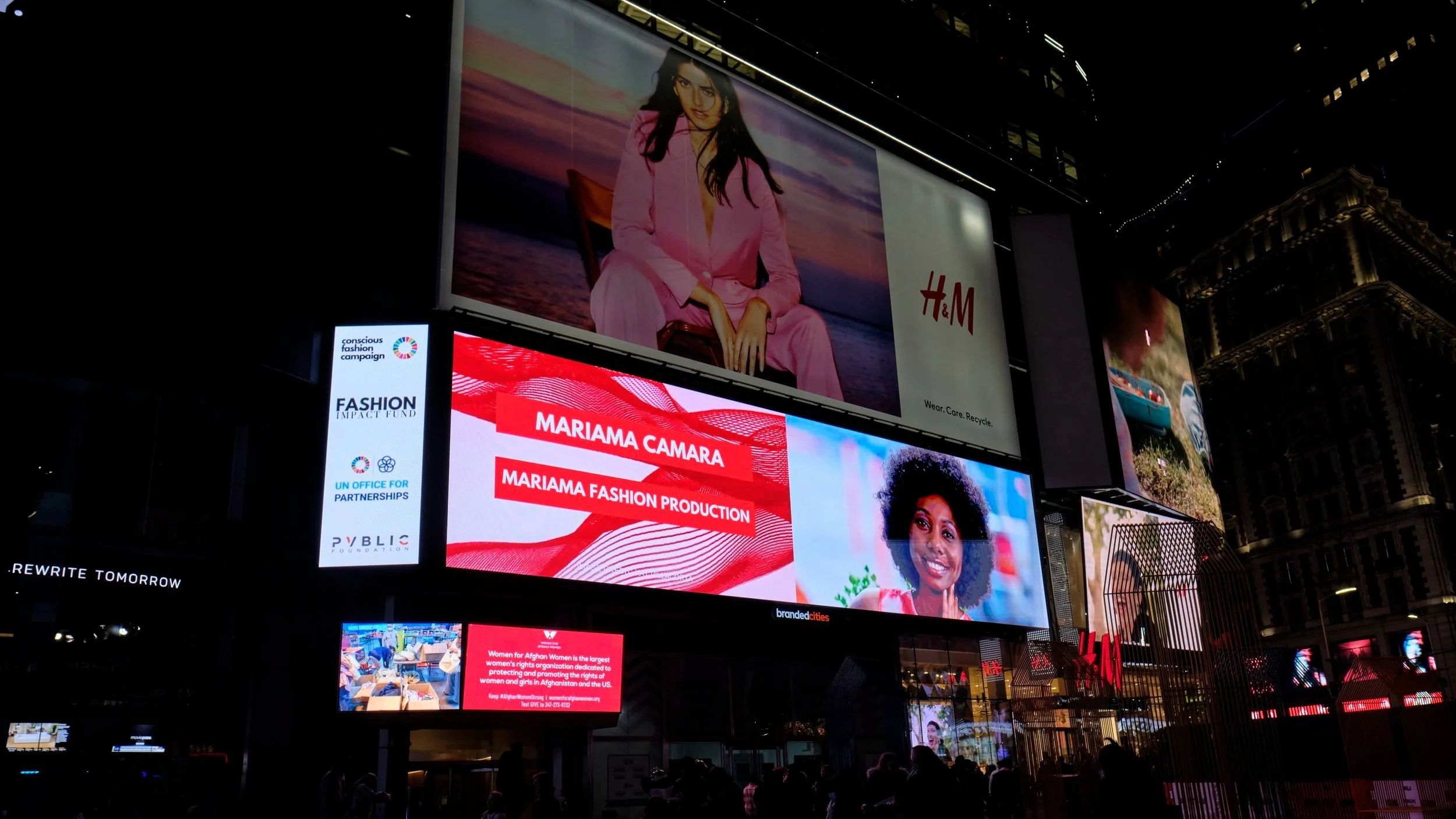 In 2021 - 2022, the Conscious Fashion Campaign led New York Fashion Week digital billboard activations to amplify women entrepreneurs driving sustainable fashion innovation. 20 global female founders were featured in 10 digital billboards at iconic New York City locations, including NASDAQ Times Square, Spring Studios and the United Nations, with additional high-visibility placement on the New York Subway and Metro-North train network, reaching 1.5 million people through 6,300 billboard plays and gaining recognition in Forbes, InStyle, and WWD.